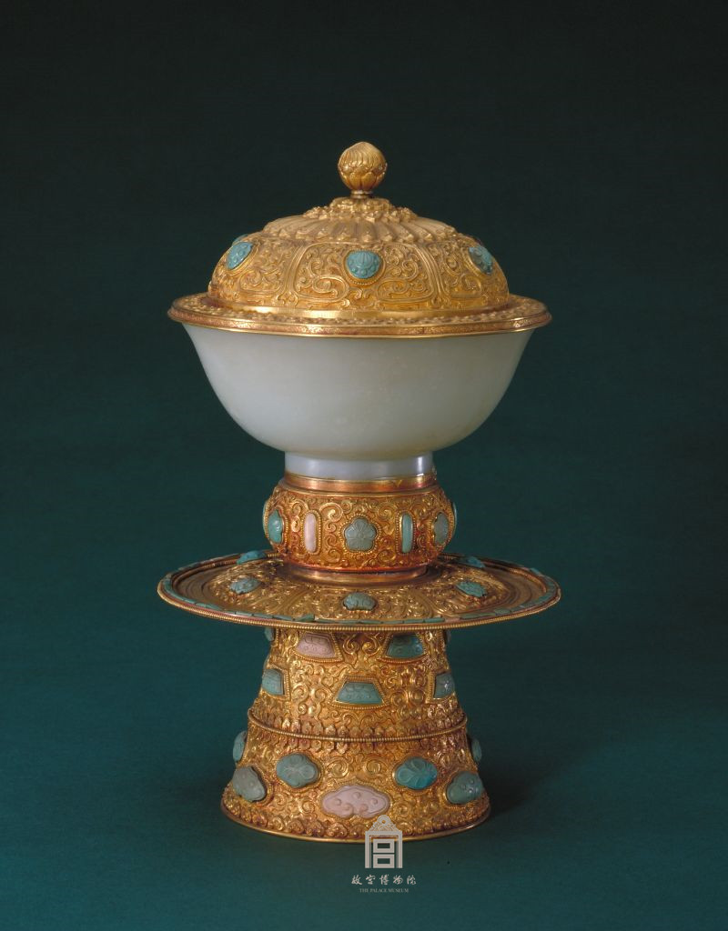 清代宮廷使用的蓋碗種類很多,金、玉組合的作品則較少。這件蓋碗的金工精致,玉質(zhì)絕佳,托、蓋、碗渾為一體,既實用又有很好的陳設(shè)效果。