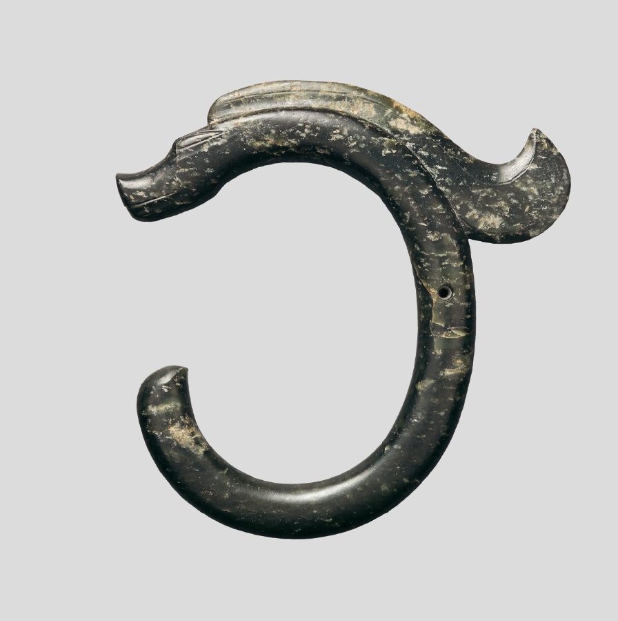 關(guān)于龍的起源說法不一,有蜥蜴說,鱷魚說,至于龍首則有來自馬首、牛首或豬首之說。這件新石器時代紅山文化玉龍是中國已發(fā)現(xiàn)的時代較早的龍的形象之一,從其首部特征看,吻部較長,鼻并上翹起棱,端面截的鼻孔,似有豬首特征,是研究中國龍起源的重要資料。且新石器時代紅山文化玉龍用黑綠色玉制成,琢磨精細(xì),具有相當(dāng)高的藝術(shù)價值。