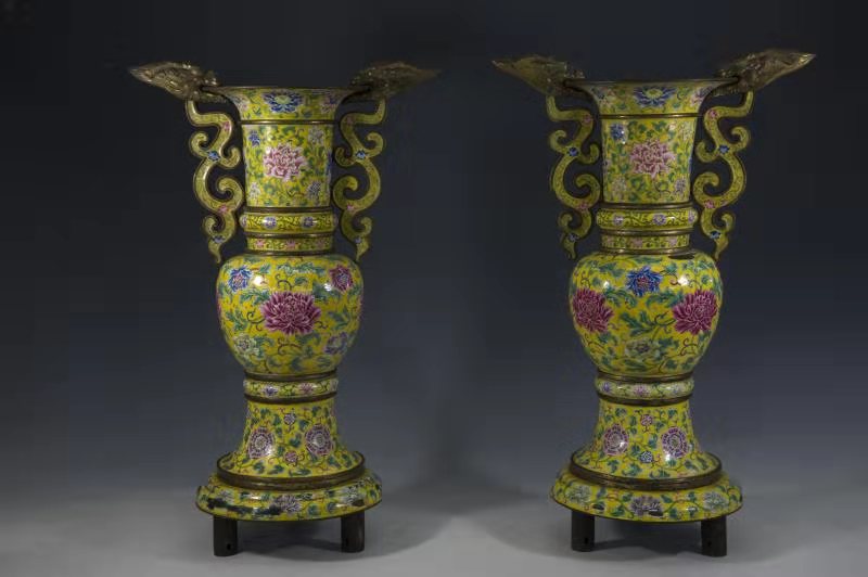 ——雍正黃地彩繪纏枝牡丹紋銅胎畫琺瑯尊 ?