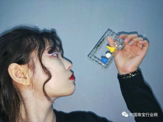海洋贈之以美,人類饋之以棄。我們從海洋中汲取我們需要的,卻“贈予”海洋無窮無盡的污染與垃圾。整套作品是有畫面感的,胸針是俯視的珊瑚礁的形態(tài),戒指是海浪,耳飾是翱翔的海鷗。這在傳統(tǒng)套件設(shè)計上做了細微小突破。整套作品是一幅由“海底珊瑚礁”“海面浪花”和“海上海鷗”結(jié)合而成,采用玻璃材質(zhì)為了極致體現(xiàn)海洋的純粹與美麗。