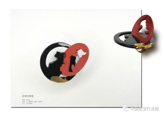 ■設(shè)計(jì)說(shuō)明:此系列由兩件胸針組成,設(shè)計(jì)元素分別為于走獸中的鳳、狻猊與斗牛和龍、天馬與狎魚(yú),脊獸造型均為高度概括的幾何化,略去裝飾,只表現(xiàn)造型特征。第一件作品中的象征富貴的鳳、象征祛邪的狻猊與象征吉祥的斗牛其內(nèi)涵經(jīng)組合表現(xiàn)為“富貴吉祥”的含義,屋脊替換為祥云紋,屋檐部分設(shè)計(jì)為錢(qián)幣紋;第二件作品中的象征權(quán)利的龍、象征自信守護(hù)的天馬與象征祛邪吉祥的狎魚(yú)其內(nèi)涵經(jīng)拓展表現(xiàn)為“平步青云”的含義,“平”為平安與守護(hù),表現(xiàn)為屋檐的盾形圖案,屋脊替換為線(xiàn)形階梯狀祥云紋,“青云”則象征更上一層樓,脊獸依次排列其上,井然和諧。