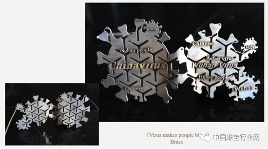■設(shè)計(jì)說(shuō)明:靈感來(lái)源于疫情暴發(fā)期間,國(guó)際上出現(xiàn)部分政客與媒體偏見(jiàn)歧視中國(guó)人的現(xiàn)象。偏見(jiàn)和歧視又何嘗不是一種病毒呢?作者用佩戴于眼部的眼鏡加上歧視性的文字(Chinavirus、Wuhan Virus等)進(jìn)行諷刺部分人的盲目無(wú)知。