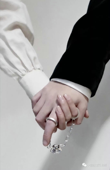 婚戒的珍貴性和獨(dú)特意義是親密關(guān)系的隱喻,伴隨著長(zhǎng)期的文化觀念成為忠貞愛(ài)情的象征符號(hào)。由“我”的鉆戒轉(zhuǎn)化為“我們”的鉆戒。對(duì)戒和鉆戒合二為一,佩戴方式合二為一。通過(guò)連接的結(jié)構(gòu)設(shè)計(jì)實(shí)現(xiàn)互動(dòng)關(guān)系的建立。