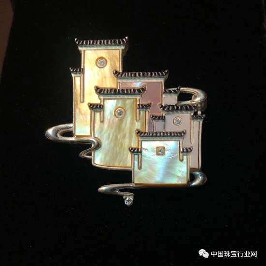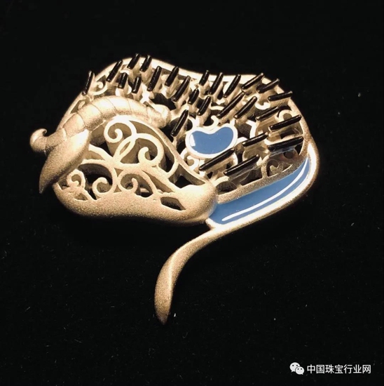 ■設(shè)計(jì)說(shuō)明:在我實(shí)地尋訪(fǎng)徽派建筑期間,我被它的設(shè)計(jì)風(fēng)格深深吸引,在村口眺望遠(yuǎn)方時(shí)群山綿綿,走入村落是流水潺潺。遠(yuǎn)、近、動(dòng)、靜完美結(jié)合,讓我感受到古代徽州人的勤勞、智慧和勇氣,以及他們追求集天地人之靈氣的自然生活方式。我設(shè)計(jì)的這一系列胸針將群山的形象通過(guò)簡(jiǎn)化的手法加以表現(xiàn),水流夸張地從山與山之間流淌而出,從一個(gè)概括加遠(yuǎn)觀的視角表現(xiàn)徽派建筑依山傍水桃園仙境的形態(tài)。我希望佩戴者能夠感受到它的恬靜與自然,體會(huì)自然和人類(lèi)之間的聯(lián)系,讓心安靜下來(lái),讓人放松下來(lái)。